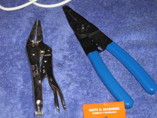 Crimp splice caps or ferruls, just a little bigger than the elastic. Brass washers, again just bigger than the elastic. Fairly cheap at about 2-3 bucks for a pack of ten. You need two caps and two washers for each leg.